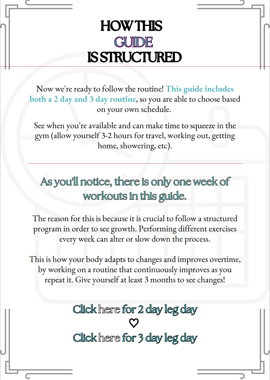 - BOTH 2 leg day and 3 leg day weeks so you can choose according to your schedule